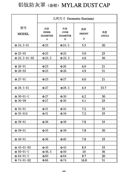 铝钛防灰罩(涤帽)参数 Mylar dust cap